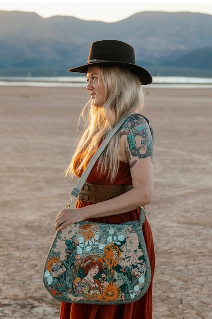 Enjoy our beautifully hand-beaded and embroidered Goddess bag in a delicate light blue tweed. Purses include zipper closure and inside pockets. Straps are adjustable to wear off the shoulder or as a crossbody bag.