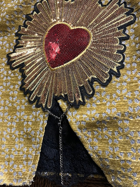 Fun little rocker vibes with this soft golden mini with sequin heart design. Black lace and charm embellish the hemline.